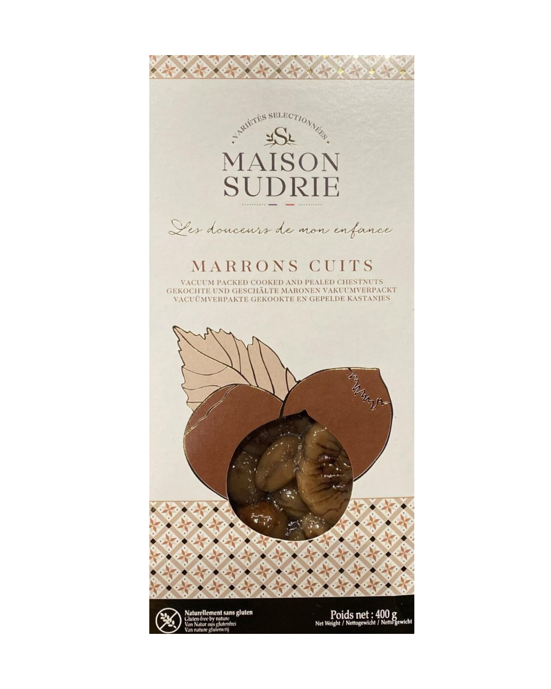Marrons cuits sous vide au naturel prêts à l’emploi, décortiqués de manière naturelle, à la flamme.